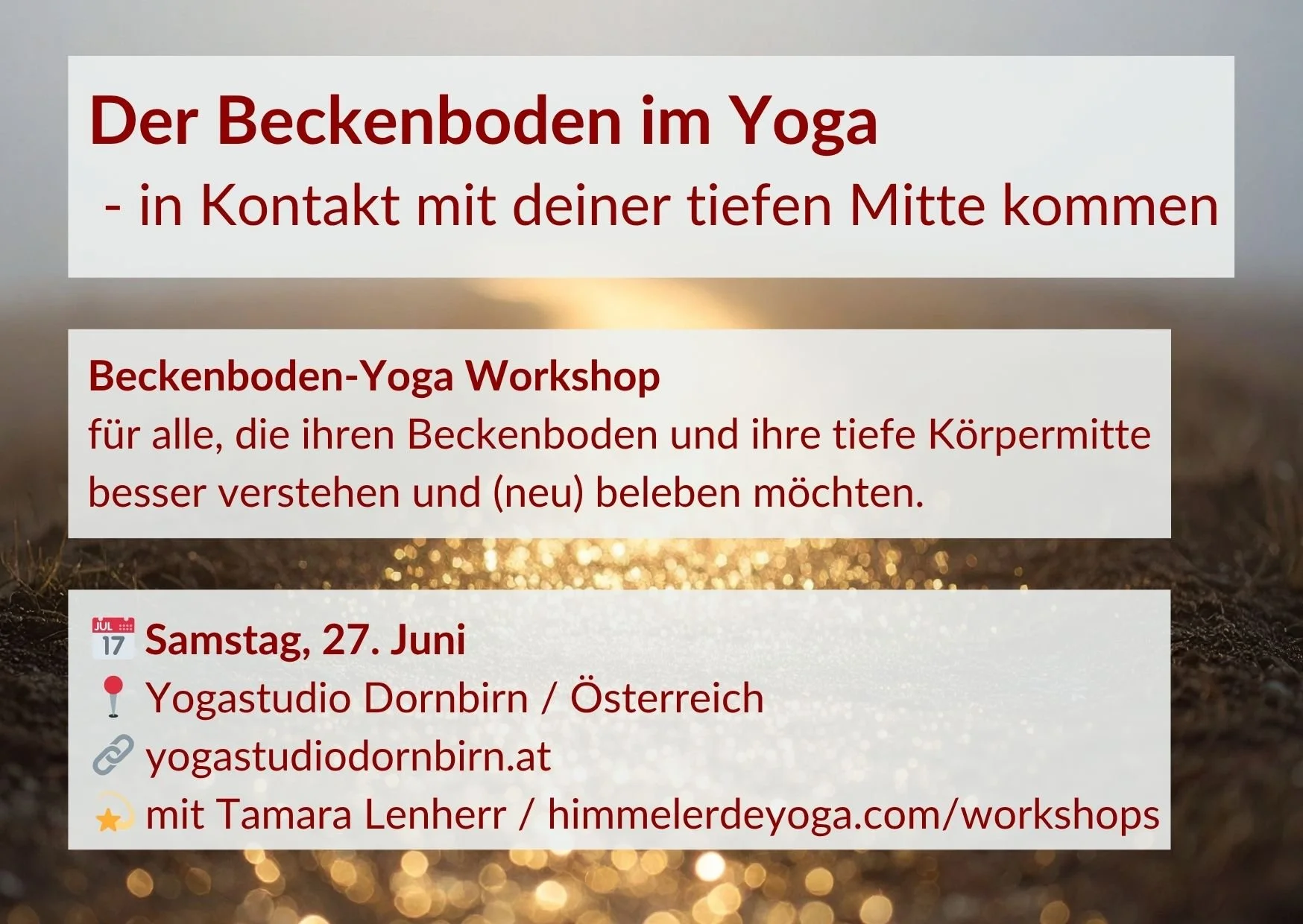 In diesem Workshop widmen wir uns achtsam dem Spüren und Beleben des Beckenbodens. Mit gezielten Yogaübungen, bewusster Atemlenkung und feiner Körperwahrnehmung vertiefst du den Kontakt zu deinem Beckenraum – deiner tragenden Basis.